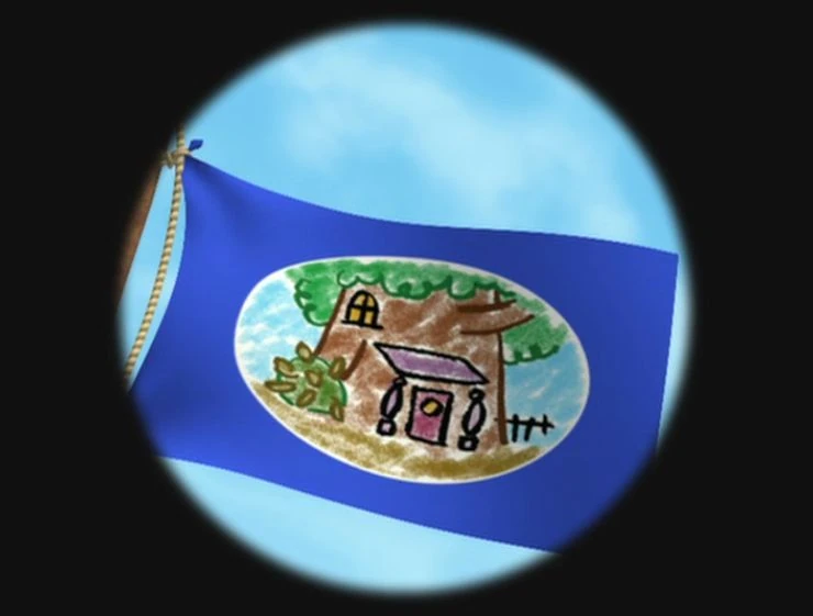 Darby looks around and notices that she and Buster are the only ones there. She points out that it's weird that Tigger and Pooh aren't present and concludes that they will have to solve the case on her own. Then, she puts on her cap and Buster barks. She asks if we're ready to say the oath and then recites it, all by herself, with one bark from Buster. Buster barks again and shakes to flip his tags over to a question mark. Darby pulls out a telescope and takes a look at the Finder Flag, which shows Kanga and Roo's house.