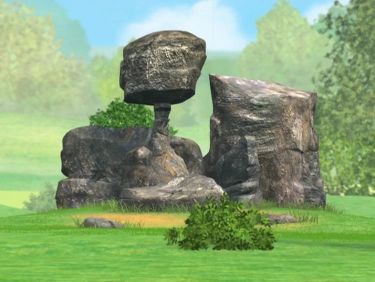 The scene changes back to Darby and Buster, who are in the meadow and are looking around, trying to figure out what Beaver meant by a "giant rock lollipop." Suddenly, she spots a strange rock formation that does indeed look rather like a lollipop. She and Buster go take a look and indeed, right beside the giant rock formation is the lemon tree. Darby is excited to pick the lemons, but realizes that it could be a problem because the lemons are up really high. She decides to try climbing the tree, but she struggles and then slides down. "I guess I won't climb the tree," she realizes. She says she wishes Pooh were there because he's really good at climbing. Buster barks and jumps. "Good idea, Buster," says Darby, thinking that maybe she could jump to reach the lemons. She tries that, and she almost reaches a lemon but it doesn't work. She says she wishes Tigger were there because he could easily reach the lemons by bouncing. Buster whines and Darby comes up with another idea. She thinks that maybe if they can't get to the lemons, they could instead get the lemons to come to them. Buster gives a little questioning bark. Darby begins shaking the tree, singing a little tune to go along with it: