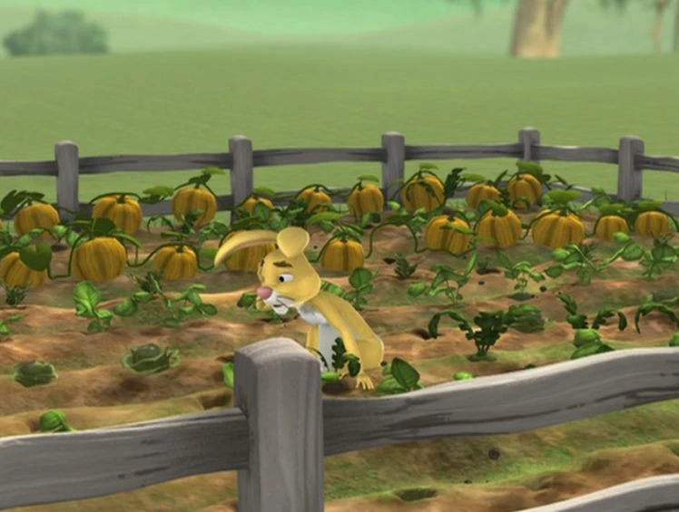 The scene changes to Rabbit's place, where Rabbit is out in his garden, singing a little tune to himself. He asks why Pooh and Tigger aren't with Darby, noting that it looks like she's on a case. Darby explains that they have colds, and that Kanga needs lemons. "I don't grow lemons," says Rabbit. He explains that the lemons he gets come from Beaver, who trades them to him for his vegetables, but he hasn't seen Beaver lately. "So that means we have to go find Beaver, all by ourselves," realizes Darby. Rabbit offers to come with her. "Just let me..." he says and starts to push a wheelbarrow of carrots, but then he sneezes, and flies backwards. "Oh dear," he says. Darby tells him that he might be getting a cold, and that he should get some rest. "If you're sure," agrees Rabbit, before wishing Darby luck and sneezing again. "Feel better, Rabbit," says Darby. She leaves with Buster.