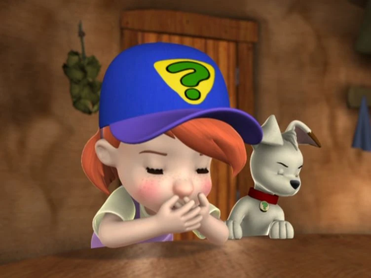 As Darby walks along to find Beaver, she says that it's great having us along because, as she puts it, "It'd be really lonely being on a Sleuth case by ourselves." She says it's a good thing that it's a simple case because all they need to do is find Beaver, who is always at the stream building his dam. Darby arrives at the stream, but Beaver is most definitely not there. "Where could he be?" she wonders. Buster barks and Darby, interpreting his barking, says that is a good question just as if Pooh and Tigger were there. The The Question Song’ sequence plays and then Buster barks excitedly and runs over to what appears to be a set of footprints. Darby praises him and the two follow the tracks and find Beaver, who is singing his "Work, Work, Work" song, but he sneezes in place of the word "do", so the last sentence sounds like, "Work, work, work, work, is all I seem to-- achoo!". He tries to balance the remains of a tree on a point, but it falls over when he sneezes. "Beaver, we've found you!" says Darby, running over, noting that he apparently has the same cold as the others. "A cold?" questions Beaver. He says he thought it was hay fever, but then again, his nose has been running so much, he thought of entering it in a foot-race. Darby laughs and says, "You should really get some rest. It's important to take it easy when you've got a cold." He says that rest sounds like a good idea and lays down. Darby tells him that before he falls asleep, she was wondering if he could help with the case. She explains that they're looking for lemons for Kanga's Cure-a-Cold soup. He says that he's "fresh out" of fresh lemons. Darby groans, but Beaver says that he can tell her where he gets them from. He gets them from the lemon tree, which is in the meadow, near a "giant rock lollipop". "What could that mean?" wonders Darby as Beaver falls asleep.