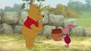 Pooh sees a beehive nearby the place where they're going to build the pit. He invites Piglet to help him get the hive. After a failed attempt, Pooh is so hungry for honey that he starts imagine everything around is honey. Doing so, Pooh accidentally falls into the Backson's pit. Rabbit, Kanga, Roo, Owl, and Eeyore follow suit after a failed attempt getting him out of it. Piglet tries to get his friends out, but to no avail. Then he runs into Tigger in the Backson disguise. Mistaking him for the actual monster, they give chase. After the chase, Piglet himself falls into the pit and Eeyore reminds Tigger that he's the only one and that the most wonderful thing about Tiggers is being the only one. Eventually, the gang escapes the pit by making a ladder out of fallen letters from the storybook. They soon find Christopher Robin, who clarifies that he wrote "back soon," not "Backson."